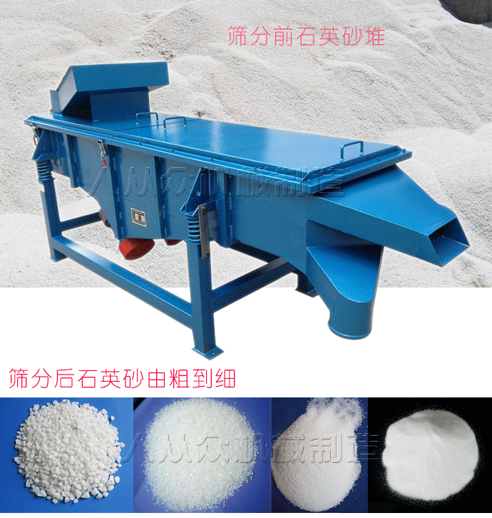 石英砂直線篩在振動電機的帶動下,石英砂跟隨著產(chǎn)生的直線推動力做向前的直線跳躍運動,顆粒小的會通過篩網(wǎng)落下去完成分級或者進入下一次分級。