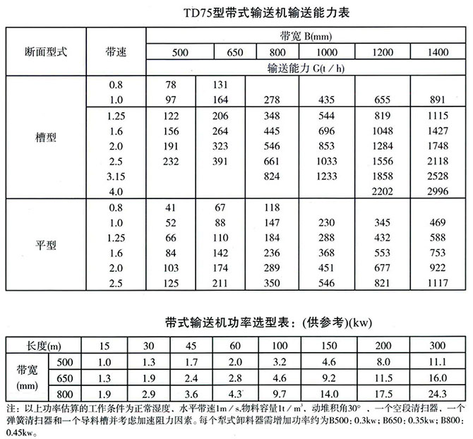 TD75型通用固定帶式輸送機由于輸送量大,結構簡單,維護方便,成本低,通用性強等優(yōu)點,而被廣泛地應用在冶金、礦山、煤炭、港口、交通、水電、化工等部門,進行裝車、裝船、轉載或堆積各種常溫狀態(tài)的松散密度為500~2500kg/m3各種散狀物料或成件物品。輸送機的工作環(huán)境溫度一般在-10℃-+40℃之間,要求物料溫度不超過70℃;耐熱橡膠帶可輸送120℃以下的高溫物料。物料溫度更高時不宜采用膠帶輸送機。當輸送具有酸性堿性油類物質和有機溶劑等成分的物料時,需采用耐油、耐酸堿的橡膠帶或塑料帶。帶式輸送機的帶寬有六種:500、650、800、1000、1200和1400mm。用戶可根據(jù)帶式輸送機的輸送高度,物料的種類、容量、輸送量、輸送長度等諸因素通過計算確定輸送機的布局以及所選用的膠帶寬度、帆布層數(shù)和膠帶厚度。